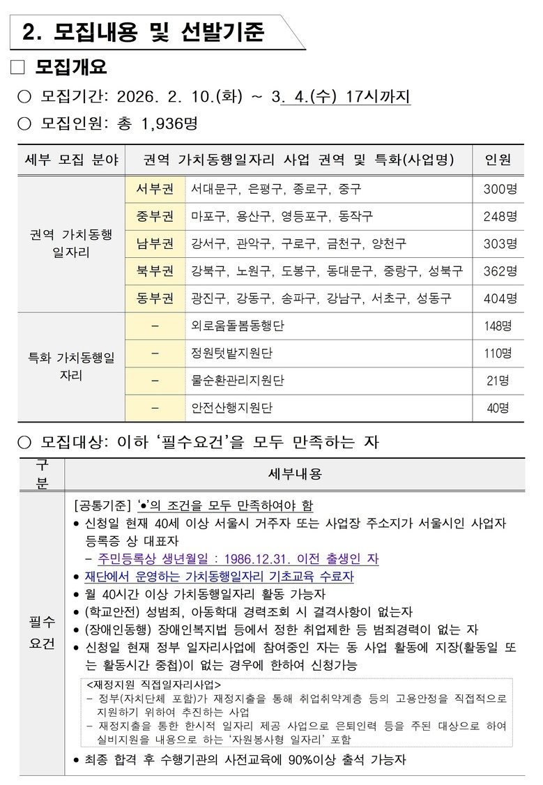 이번 1차 모집은 거주지 인근에서 활동할 수 있는 ‘권역별 일자리’(1,617명)와 특정 활동 분야를 선택해 지원하는 ‘특화 일자리’(319명)로 구분하여 운영된다.