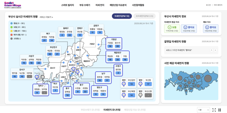◈ 플랫폼의 주요 서비스는 ▲육상기인 부유쓰레기 모니터링 ▲해양미세먼지 모니터링 ▲지역 해양산업 이슈분석 ▲시민참여형 서비스 등 [세계타임즈=부산 이용우 기자] 부산시(시장 박형준)는 부산지역 해양환경 현안에 대한 과학적 의사결정을 지원하고 시민참여를 통한 지속 가능한 해양환경 관리 체계 마련을 위해 구축한 '스마트오션빌리지' 플랫폼 서비스를 오늘(27일)부터 본격 개시한다고 밝혔다.