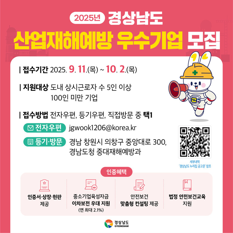 - 8개 기업 선정 예정, 이차보전 우대금리 등 각종 인센티브 지원 확대해 [세계타임즈=경남 최성룡 기자] 경상남도(도지사 박완수)는 ‘2025년 경상남도 산업재해 예방 우수기업 인증 사업’ 접수를 시작했다고 밝혔다.