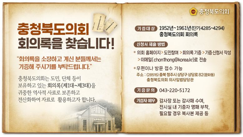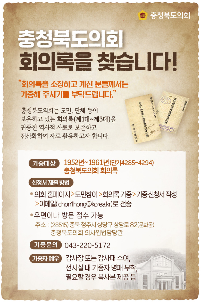 수집 대상은 1952~1961년 10년 동안의 충북도의회 회의록(제1~3대)으로 소장하고 있는 개인이나 단체가 기증하면 전산화해 사료로 보존 활용한다.