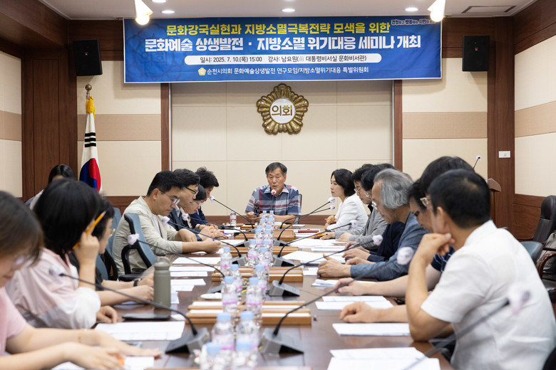 [순천시 세계타임즈=우덕현 기자] 순천시의회(의장 강형구)는 지난 7월 10일, 의원연구단체인 ‘전남 동부권 문화예술상생발전 연구모임(이하 문화예술 연구모임)’과 ‘지방소멸 위기대응 특별위원회(이하 지방소멸 특위)’ 공동 주관으로 「문화예술 상생발전ㆍ지방소멸 위기 대응 세미나」를 성황리에 개최했다고 밝혔다.