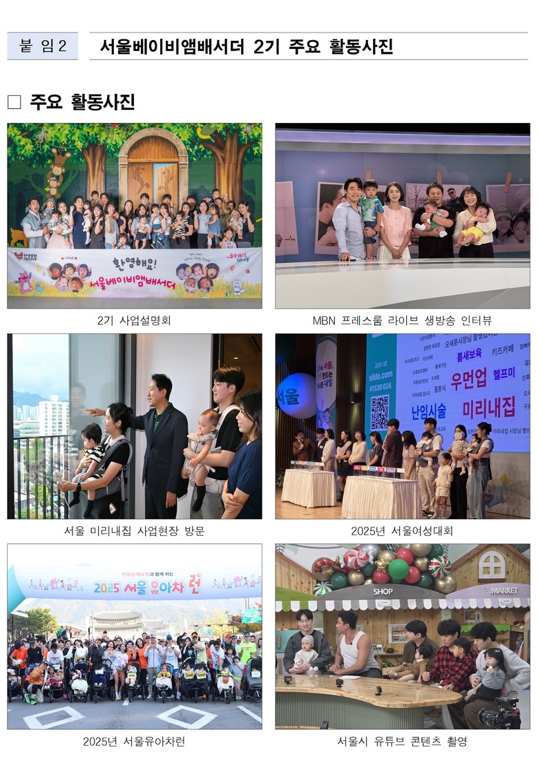 한편, 지난해 1,317가족이 지원하면서, 약 165대 1의 경쟁률을 뚫고 최종 선발된 서울베이비앰배서더 2기는 <원더걸스> 혜림, ‘러닝전도사’ 안정은 등 8가족이 활동했다. 약 6개월의 활동기간 동안 각자의 개성과 강점을 살린 총 272개 콘텐츠를 제작, 누적 조회수 650만 회를 기록할 정도로 많은 공감을 이끌어냈다.