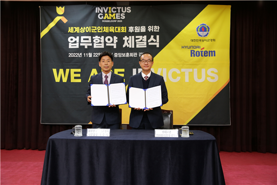 11월 22일 서울 여의도 중앙보훈회관에서 대한민국상이군경회 이수덕 사무총장과 현대로템 김익수 경영지원사업부장 등 주요 관계자가 참석한 가운데 세계상이군인체육대회 지원을 위한 업무협약서에 서명했다.