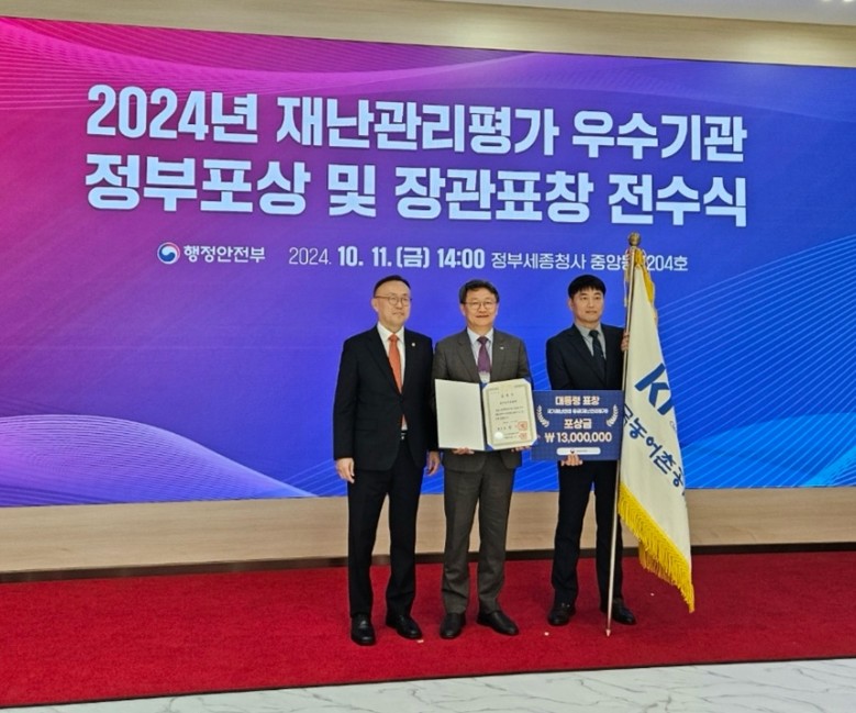 [세계타임즈 = 이영진 기자] 한국농어촌공사는 11일 행정안전부 주관으로 열린 ‘2024년 재난관리 평가 정부포상 전수식’에서 대통령표창을 수상하며, 탁월한 안전관리 역량과 재난대응 성과를 인정받았다.