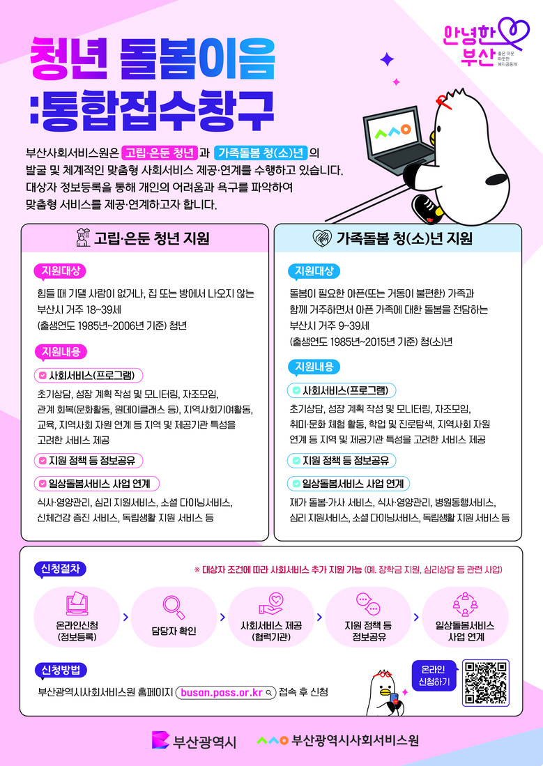 ◈ 고립은둔 청년과 가족돌봄 청(소)년은 부산사회서비스원 누리집(busan.pass.or.kr)을 통해 사회서비스 지원 요청할 수 있으며 바로가기 QR코드를 통해서도 접속 신청 가능 [세계타임즈=부산 이용우 기자] 부산광역시사회서비스원(원장 유규원)은 부산광역시(시장 박형준)와 함께, 부산의 고립·은둔 청년과 가족돌봄 청(소)년 대상으로 “맞춤형 사회서비스 제공 및 연계 지원을 위한 청년 돌봄이음 사업”을 실시하고 체계적인 대상자 발굴 및 서비스 신청 등을 위한 통합접수창구를 지역 내 최초 개설 및 상시 운영한다.