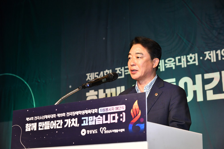 [경남 세계타임즈=최성룡 기자] 경남도의회 최학범 의장은 8월 29일 창원 리베라컨벤션에서 열린 「제54회 전국소년체육대회 및 제19회 전국장애학생체육대회 자원봉사 해단식」에 참석해 대회의 성공적인 개최에 기여한 자원봉사자들을 격려했다.