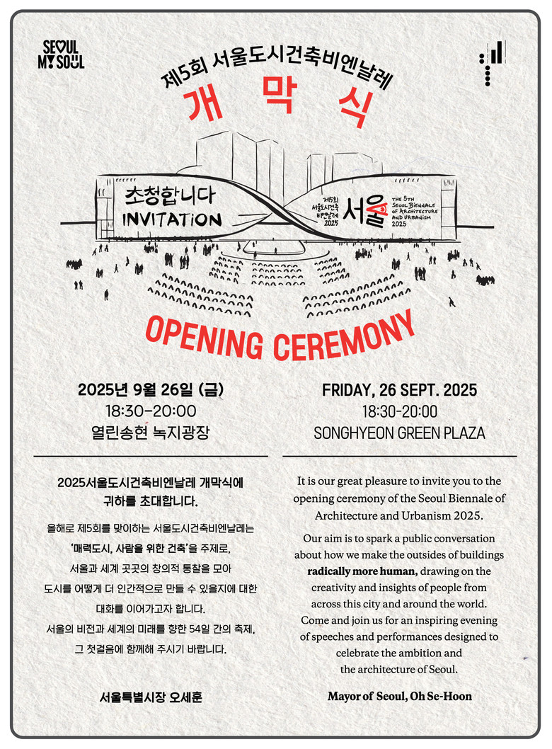 우선 서울비엔날레의 정식 시작을 알리는 <개막식>이 26일(금) 오후 6시 30분, 열린송현 녹지광장에서 개최된다.