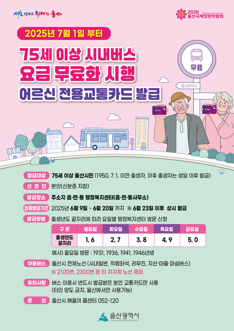 이 사업은 민선 8기 후반기 핵심 과제인 ‘울부심 생활+ 사업’의 일환으로, 산업수도의 주역이었던 고령층 시민에 대한 예우와 교통복지 확대를 목표로 추진된다.