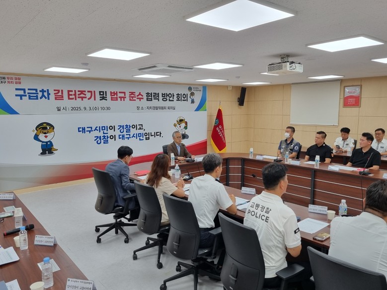 ▸ ‘긴급구급차 길 터주기’ 핵심과제로 현안 공유 등 협업의 장 마련 [세계타임즈=대구 한윤석 기자] 대구광역시 자치경찰위원회는 9월 3일(수), 대구시청 산격청사에서 대구시 보건의료정책과, 대구경찰청, 11개 경찰서, 7개 민간이송업체와 함께 ‘긴급구급차 길 터주기’ 및 비긴급 구급차 법규위반 예방을 위한 간담회를 개최했다.