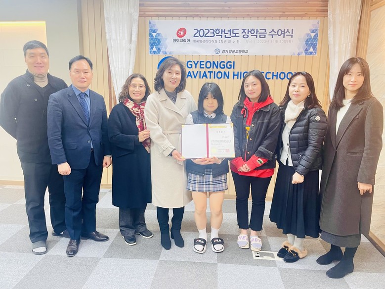 [광명시 세계타임즈=송민수 기자] 2023년 11월 30일, 경기항공고등학교(교장 유형진, 이하 ‘경기항공고’)에서 열린 ‘사단법인 아이코리아 장학금 수여식’에서 아이코리아 회장이면서 경기도 여성단체 협의회 광명지회 회장, 광명시 놀탄(놀면서 탄소중립) 운영위원장이기도 한 김지영 회장이 경기항공고 2학년 최세진 학생에게 200만원의 장학금을 수여했다.