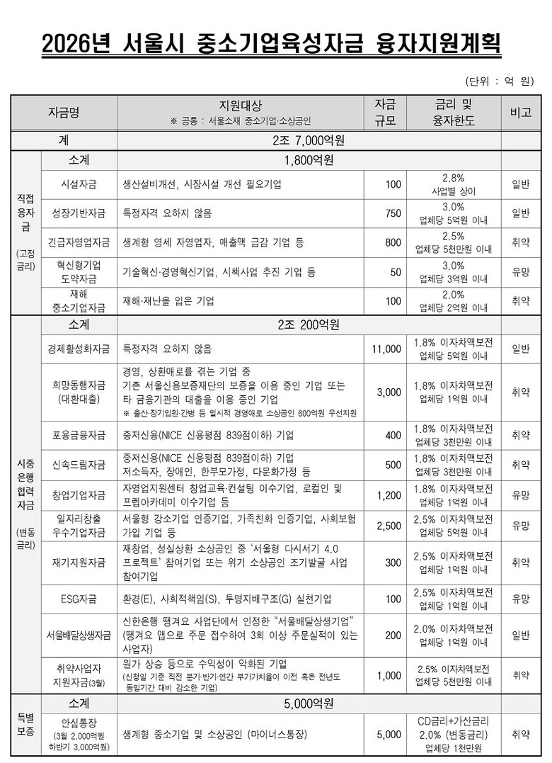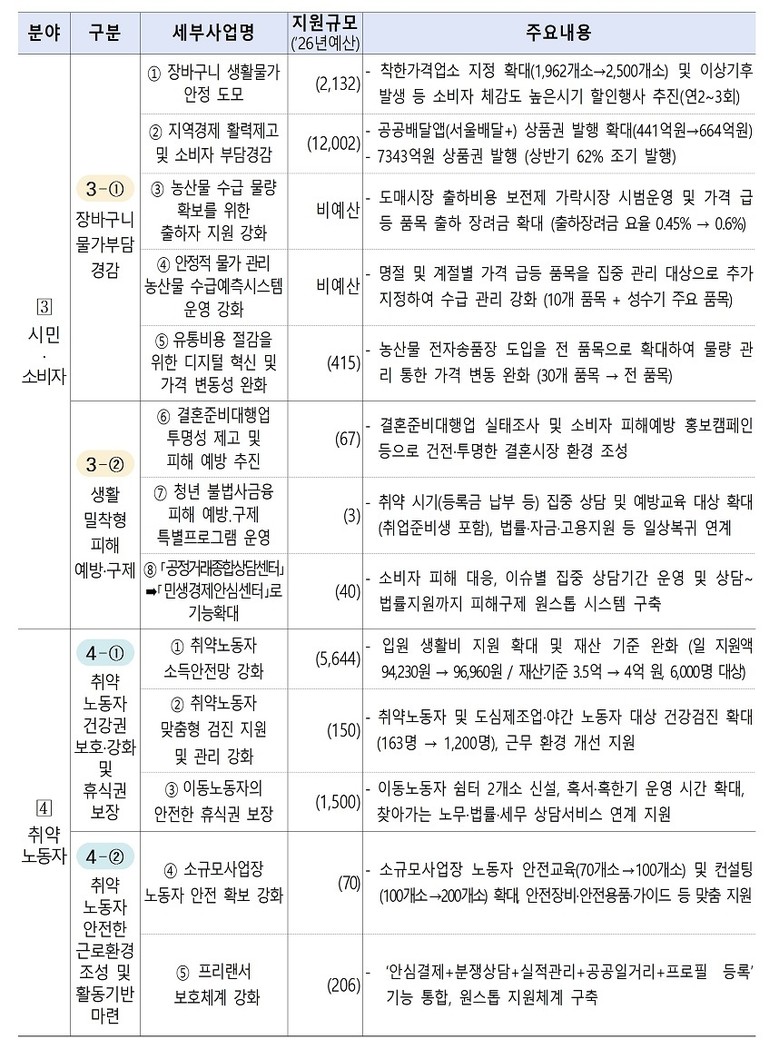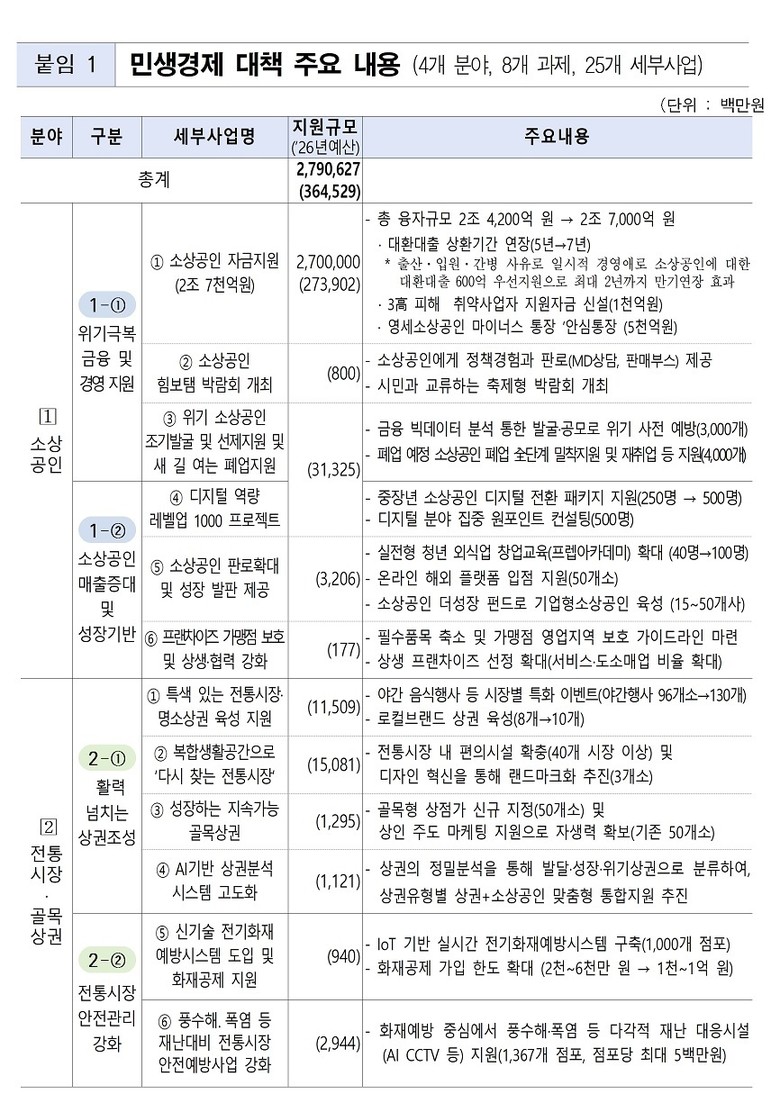 서울시는 ▴소상공인 ▴골목상권 ▴소비자 ▴취약노동자 등 경제불황 속 가장 먼저 위기에 직면하는 4대 계층에 대한 활력 회복을 주요 내용으로 하는「2026년 민생경제 활력 더보탬」을 9일(월) 발표했다. 총 2조 7,906억 원을 지원해 4대 분야 8개 핵심과제, 25개 세부사업을 추진할 계획이다.