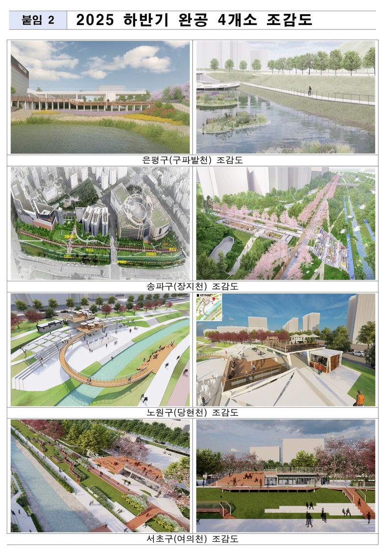 한편 시는 ‘1자치구 1수변활력거점’ 조성을 목표로, 올해 말까지 ▴서초구 여의천 ▴은평구 구파발천 ▴송파구 장지천 ▴노원구 당현천 등 4곳을 추가로 완공할 계획이다.