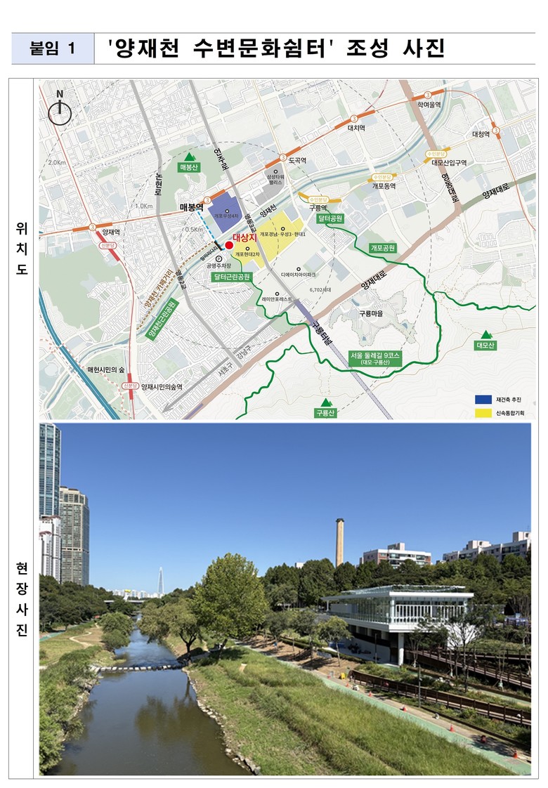특히 ‘양재천 수변문화쉼터’는 대모산·구룡산으로 이어지는 서울둘레길 코스의 ‘출발마당’과 바로 인접해 있어 접근성이 뛰어나, 시는 이곳이 산책과 트레킹을 즐기는 시민들이 반드시 들르는 둘레길 성지로 자리매김할 것으로 기대하고 있다.