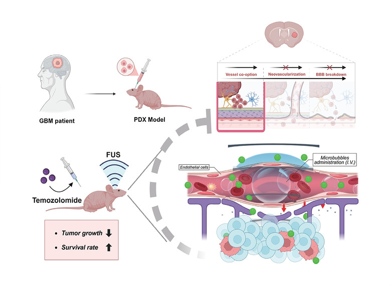 연구진은 집중 초음파로 종양 주변 정상 뇌 조직의 혈뇌장벽을 일시적으로 개방, 항암제 TMZ를 즉시 투여해 뇌종양 내 약물 전달 효율을 비교했다.