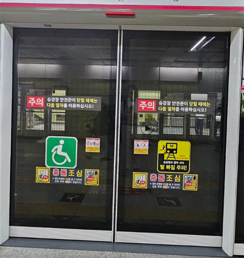 | ▲ 승강장안전문 충돌주의 스티커 부착 |