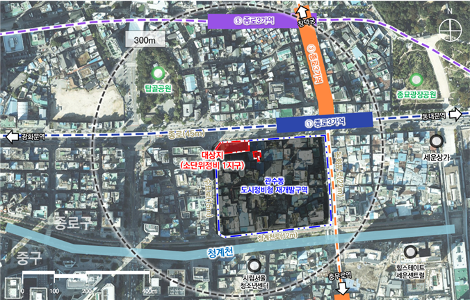 관수동구역은 탑골공원~종로3가역~청계천에 위치하고 저층의 노후불량건축물 및 화재에 취약한 목구조 건축물이 밀집하여 조속한 정비가 필요한 지역이다.