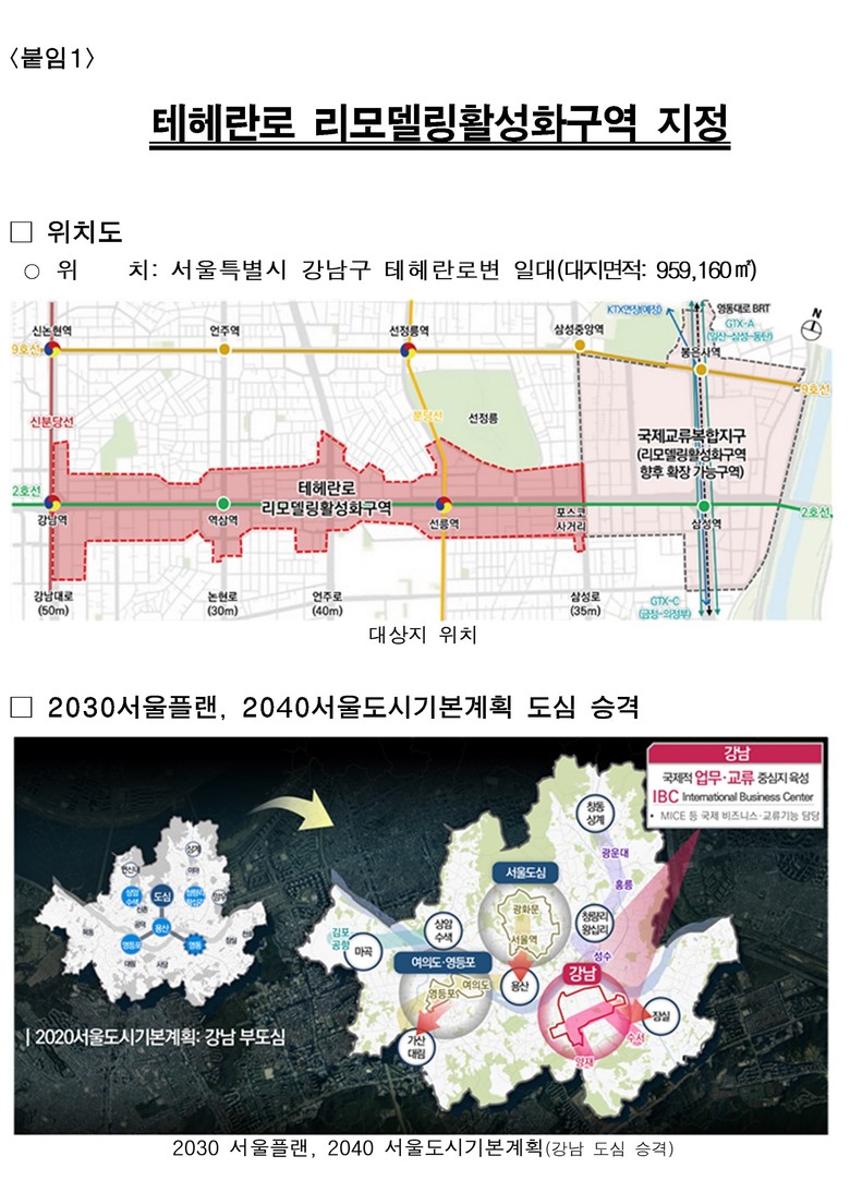 ① 테헤란로 리모델링활성화구역: 리모델링 중심 정비를 통한 도심업무기능 고도화
