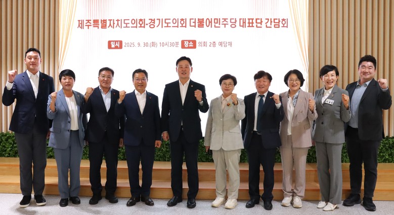 제주도의회에서 송창권 대표(외도·이호·도두동), 김기환 부대표(이도2동갑), 하성용 부대표(안덕면), 강성의 정책위원장(화북동), 홍인숙 대변인(아라동갑) 등이, 경기도의회에서는 최종현 대표의원을 비롯해 장한별 총괄수석부대표(수원4), 신미숙 기획수석(화성4), 이채명 소통·협력수석(안양6), 남종섭 전 대표의원(용인3)이 간담회에 함께했다.