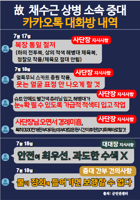 서영교 최고위원은 “ 故 채수근 상병의 할아버지께서 ‘ 억장이 무너진다 . 천인공노할 일이다 ’ 라고 하셨다 . 채수근 상병이 7 월 19 일 오전 8 시경 수색을 하다가 물살에 휩쓸렸다 . 사고가 있기 하루 전 , 사단장은 ‘ 복장을 철저히 통일하라 . 웃는 얼굴 표정 안나오게 하라 , 눈에 확 띌 수 있도록 가급적 적색티 입고 작업 하라 .’ 등의 지시를 한다 . 어떻게 하면 잘 보일까 , 어떻게 하면 두드러질까 , 이게 사단장의 지시 내용이다 .” 라고 꼬집었다 .