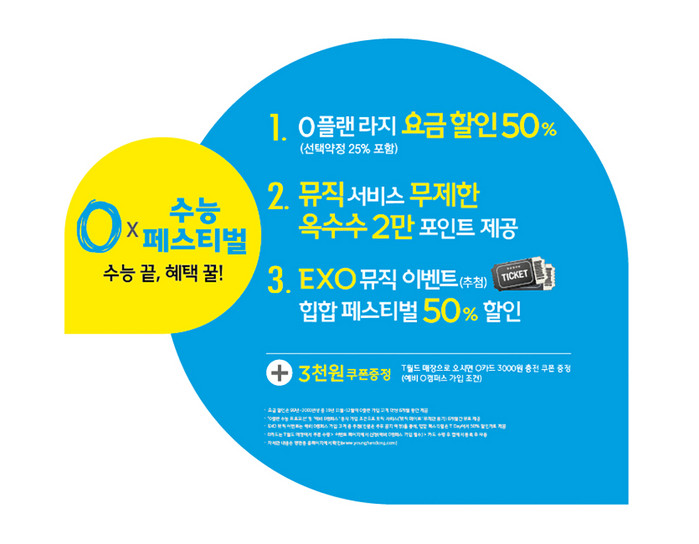 시험을 마친 수험생들을 위한 연말 콘서트 등 제공되는 문화혜택도 풍성하다. SK텔레콤은 ‘예비 0캠퍼스’ 가입 고객을 대상으로 추첨을 통해 12월 20일 고려대학교에서 열리는 <0 X FESTA with EXO> 공연티켓 4천장을 제공해 힘든 학업과 입시의 스트레스를 견뎌낸 수험생들의 새로운 출발을 응원한다.