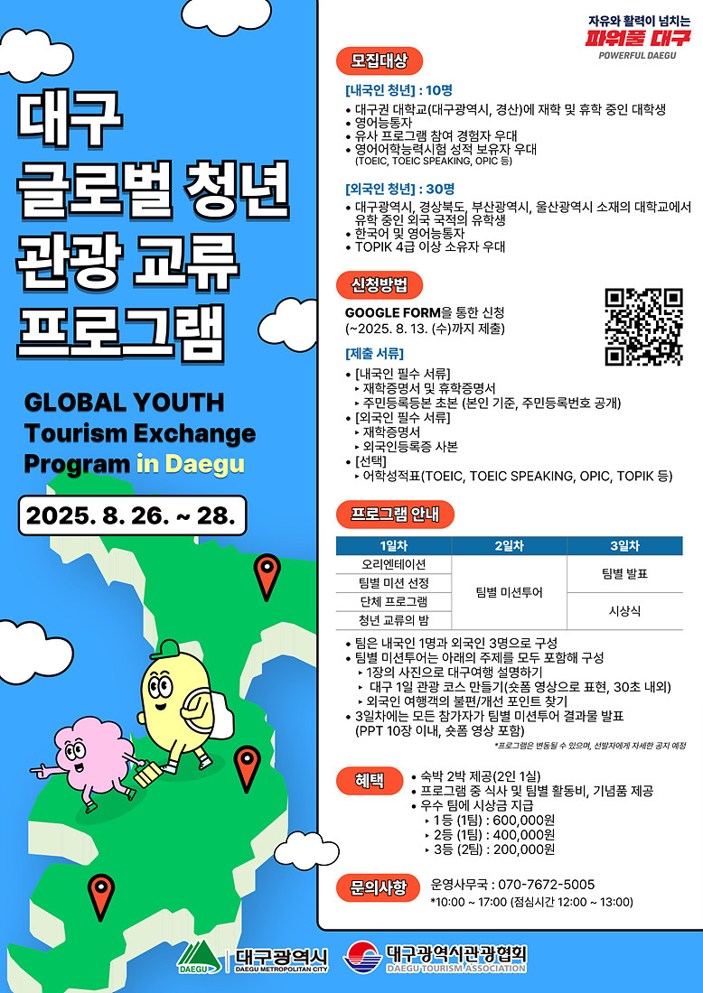 참여를 희망하는 학생은 홍보 포스터 내 QR코드를 통해 8월 13일(수)까지 신청할 수 있으며, 참가 신청 및 프로그램 문의는 대구관광협회 운영사무국(☏070-7672-5005)으로 하면 된다.
