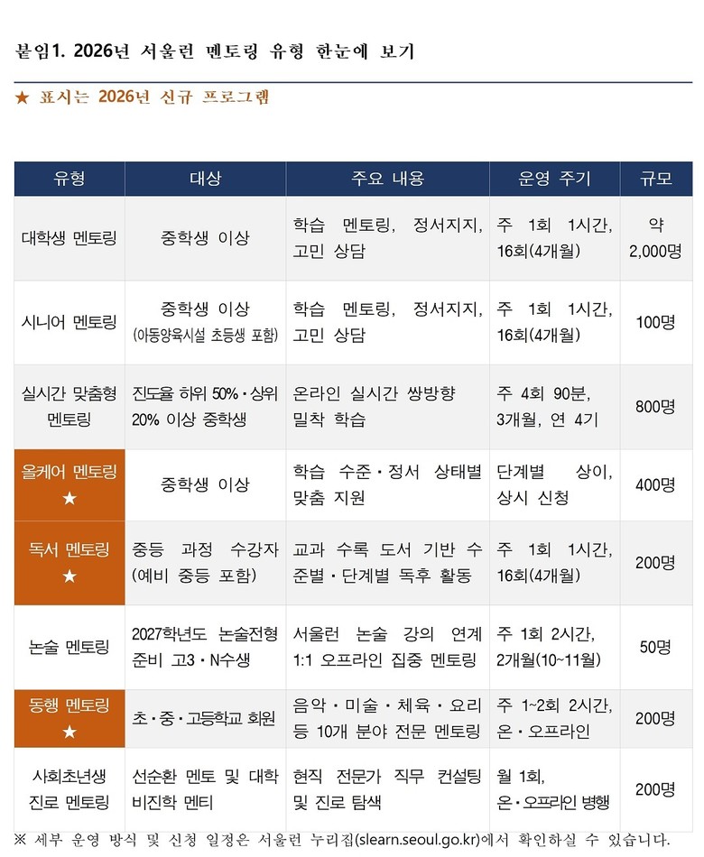 [서울 세계타임즈=이장성 기자] 서울시는 지난해 멘티 95%가 만족한 ‘서울런 멘토링’을 올해 학습·정서·예체능을 아우르는 ‘통합 성장 지원 체계’로 대폭 확대해 본격 가동했다. 시는 지난달 운영을 재개하며 ‘올케어·독서·동행’ 멘토링 3종을 신설하고, 학부모까지 지원 대상을 넓히는 등 한층 촘촘해진 멘토링 지원체계를 구축했다.