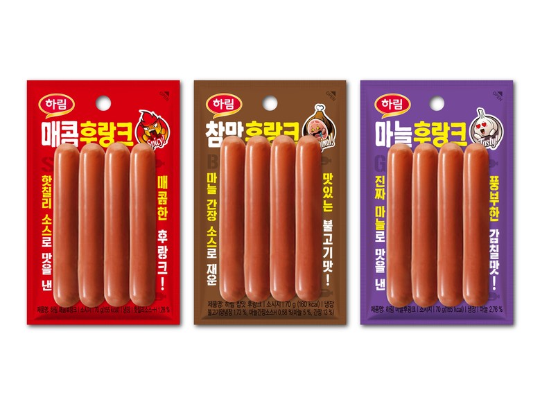 맛은 세 가지. ‘매콤후랑크’는 자극적이지 않으면서 맛있게 매운 맛을 구현했다. ‘마늘후랑크’는 마늘 향만 입힌 게 아니라 국내산 마늘 원물의 함유량을 높여 감칠맛이 풍부하다. ‘참맛후랑크’는 마늘간장 소스에 재워 불고기 맛을 제대로 담았다.
