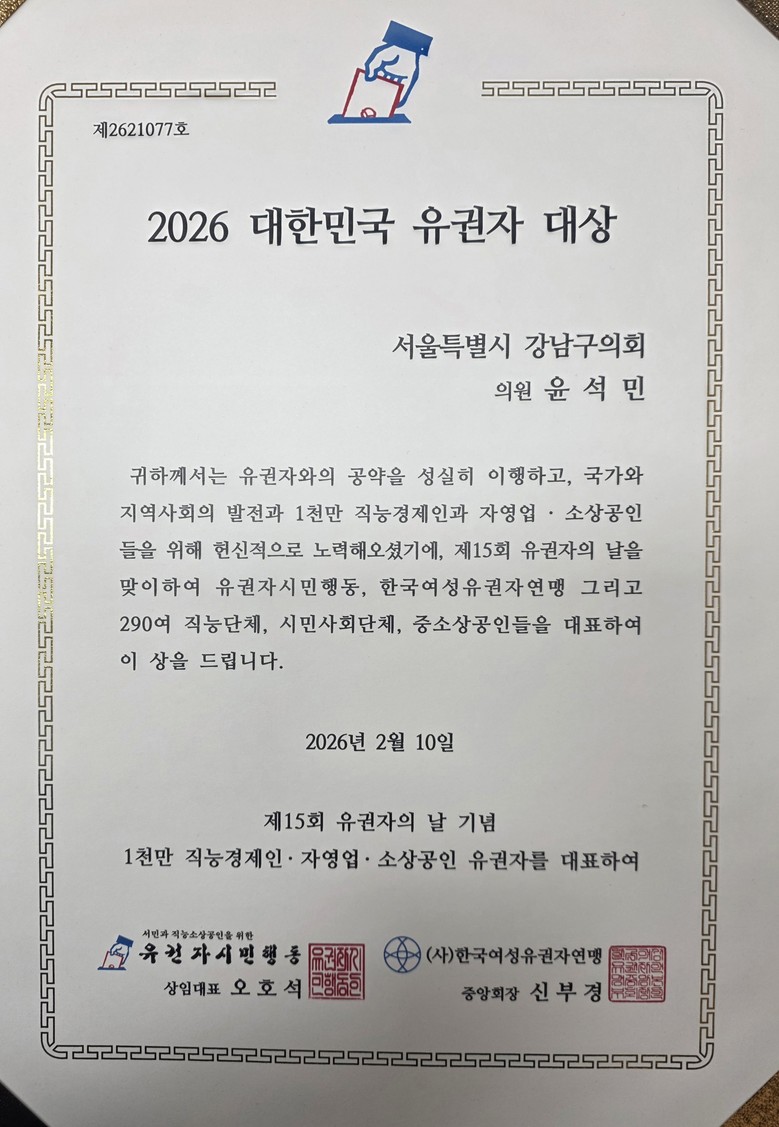 [서울 세계타임즈=이장성 기자] 서울시 강남구의회 윤석민 의원(윤리특별위원장, 재선·개포 1‧2‧4동)은 유권자 권익 보호와 책임 있는 의정활동에 기여한 공로를 인정받아 지난 10일(화) 국회의원회관 대회의실에서 열린 시상식에서 ‘2026 대한민국 유권자 대상’을 수상했다.