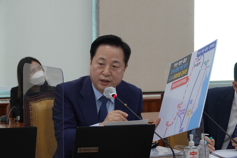 김 의원은 광역교통망 노선도가 그려진 판넬을 꺼내들며 “노포역-웅상-KTX울산역-북정-진영으로 연결되는, 부울경메가시티와 관련해서 가장 중요한 광역교통체계”라고 설명했다. 이어 “사전타당성 조사가 올 연말에 결론이 나고 내년에 예비타당성조사에 들어갈 것 같은데 잘 살펴달라”고 당부했다. “부울경메가시티를 위해서 웅상선만 챙겨달라는 것이 아니라 나주, 광주, 용문, 대구, 경북 쪽도 잘 챙겨달라”고 덧붙이기도 했다.