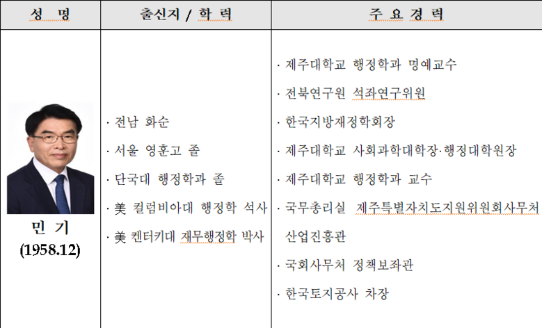 신임 민 비서실장은 국무총리실에서도 제주특별자치도지원위원회사무처 산업진흥관(국장급)으로 근무한 경험(`07~`09)이 있어, 국무총리의 국정철학에 대한 이해를 바탕으로 국무총리의 국정수행을 원활하게 보좌할 것으로 평가됩니다.