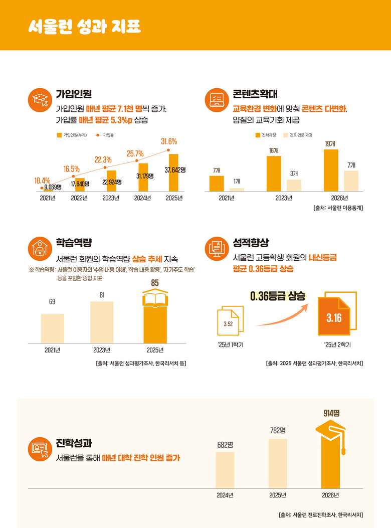 서울시 조사 결과, 올해 대학에 합격한 서울런 학생 914명 중 주요 대학‧학과 합격자는 전년 대비 21%('25년 63명→ '26년 76명) 늘어난 것으로 나타났다.
