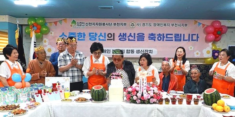 신천지자원봉사단 부천지부가 8일 경기도 장애인복지회 부천지부 어르신 9명의 ‘합동 생신잔치’를 열었다.
