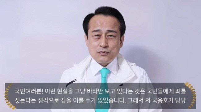 이런 현실을 그냥 바라만 보고 있다는 것은 국민들에게 죄를 짓는다는 생각으로 잠을 이룰 수가 없었습니다. 그래서 저 국용호가 당당하게 나서기로 결정했습니다. 저도 부족한 점이 많이 있습니다. 하지만 그 어느 후보보다 저는 나라와 국민을 위해서 목숨을 아끼지 않고 헌신 봉사 할 수 있는 자격을 갖추고 있는 사람이라고 생각합니다.