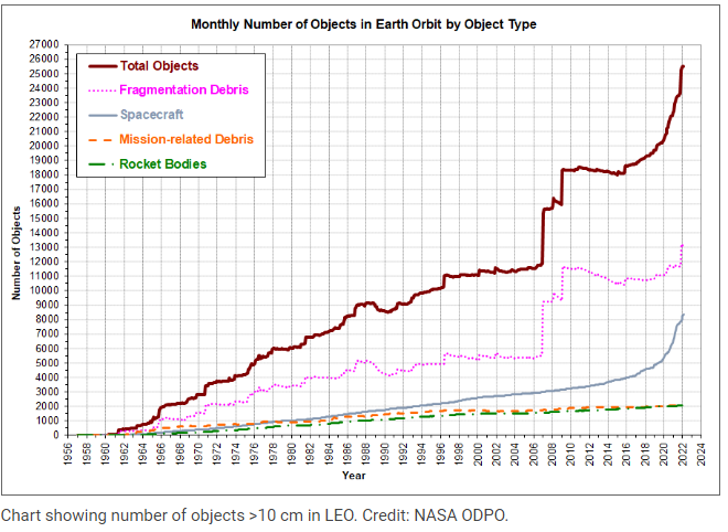 우주에서 지구로 떨어지는 인공우주물체도 문제인데 2022년에는 5년 전보다 10배 증가한 2천 5백여 건에 달하며, 17년부터 21년 추락 횟수를 모두 합친 것보다 많은 횟수다.