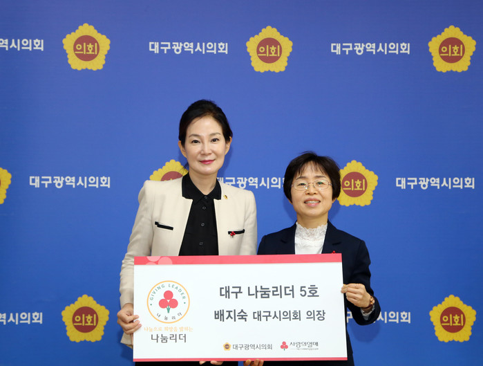 [대구=세계타임즈 한성국 기자] 대구광역시의회 배지숙 의장은 1월 4일(금) 오후 2시 접견실에서 이희정 대구사회복지공동모금회 사무처장 및 관계자들이 참석한 가운데 대구 제5호 ‘나눔리더’ 가입식을 가지고 최근 연말연시에도 불구하고 좀처럼 올라가지 못 하고 있는 사랑의 온도 100℃의 수은주를 높이는데 앞장섰다.
