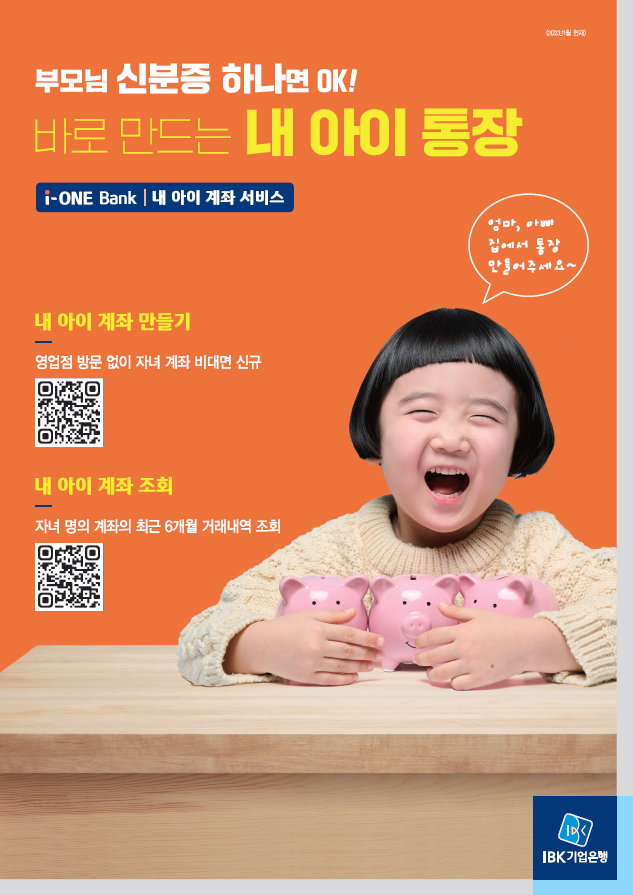 지난 9월 출시한 ‘내 아이 계좌 서비스’는 만 19세 미만의 미성년 자녀를 둔 법정대리인 부모가 기업은행 모바일뱅킹 i-ONE Bank(개인)에서 자녀계좌를 개설할 수 있는 서비스이다. 자녀가 지원 대상일 경우 주택청약종합저축 2만원, i-미래통장 1만원 금융바우처를 받을 수 있다.