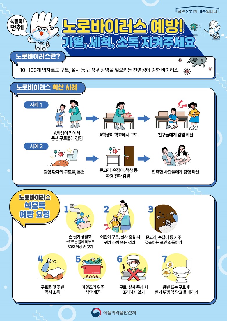 또한, 노로바이러스 등 여름철 식중독 예방을 위한 기본 위생수칙에 대한 현장 안내와 교육도 함께 실시한다. 노로바이러스는 소량의 바이러스만으로도 감염될 수 있고 전염력이 강해 사회복지시설처럼 집단생활하는 시설에서 각별한 주의가 필요하다.