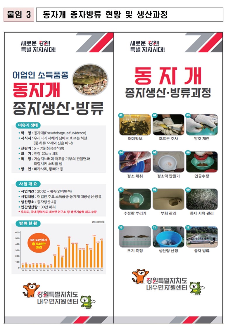 이동희 강원특별자치도 해양수산국장은 “올해 우리도는 역대 최대 생산 실적을 기록한 고유종 미유기 24만 마리, 어업인 주요 소득품종인 대농갱이 30만 마리와 곳체다슬기 72만 마리에 이어 동자개 40만 마리까지 어패류 4종 166만 마리를 방류하여 기후변화와 민물가마우지 텃새화에 따른 대량 포식 등으로 급감한 자원회복에 총력을 다해 대응하고 있다”며,