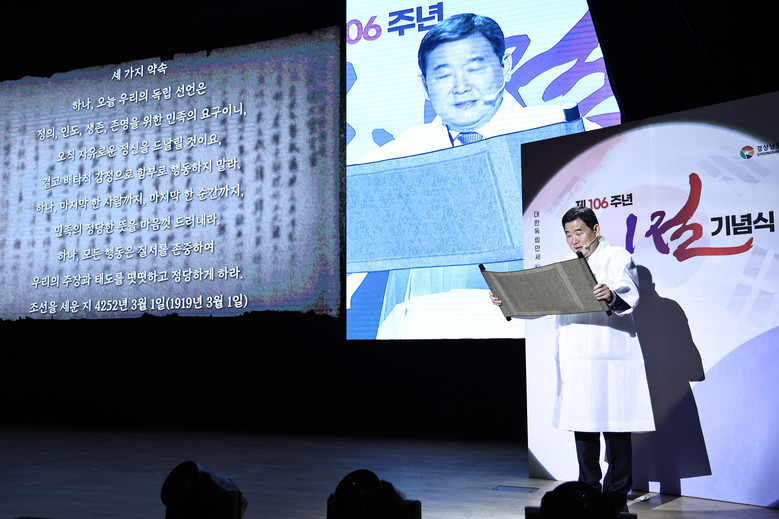 [경남 세계타임즈=최성룡 기자] 경상남도는 3월 1일 오전 10시 도청 대강당에서 박완수 도지사를 비롯해 독립유공자 유가족, 주요 기관장, 도민 등 400여 명이 참석한 가운데 '제106주년 3·1절 기념식'을 개최했다.