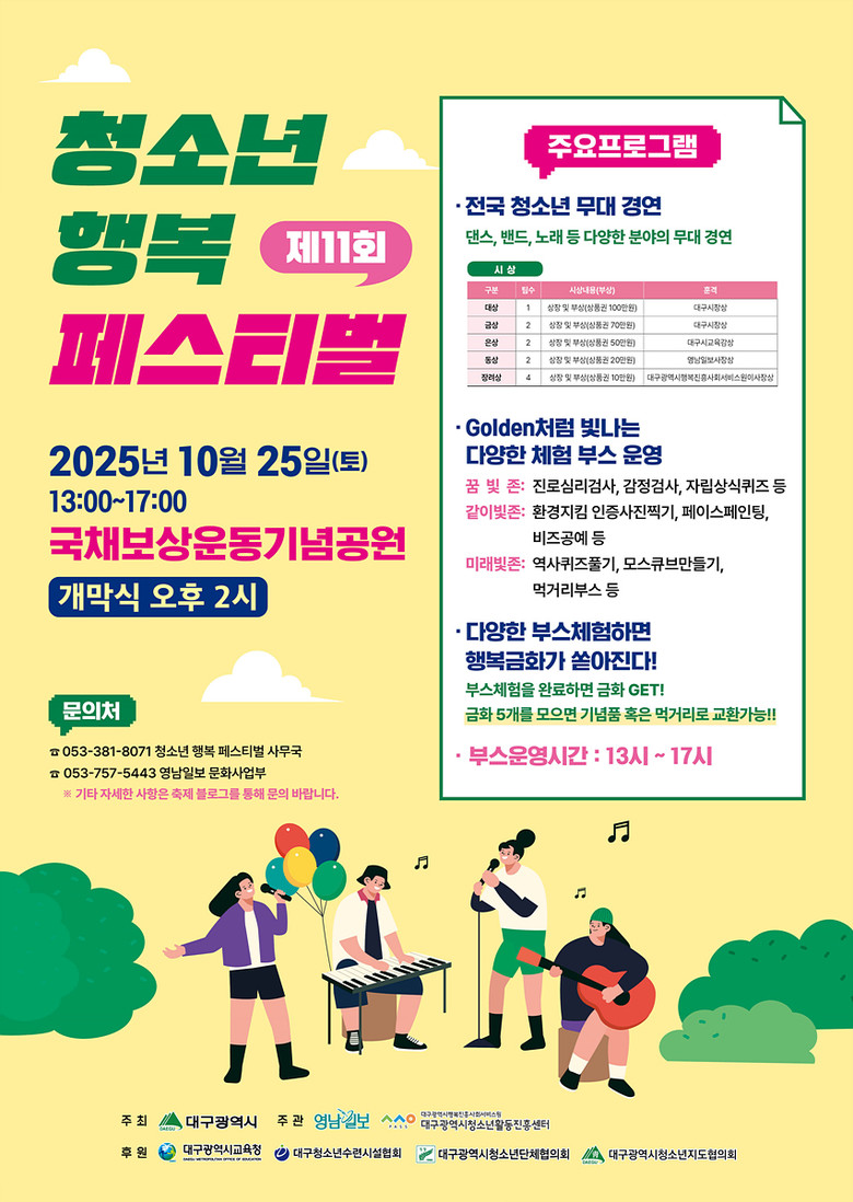 ▸ 전국 청소년 무대경연대회, 기념공연, 부스운영 등 다채로운 행사 [세계타임즈=대구 한윤석 기자] 대구광역시는 10월 25일(토) 오후 2시, 국채보상운동기념공원에서 ‘2025년 제11회 청소년 행복 페스티벌’을 개최한다.
