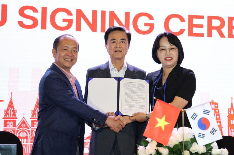 | ▲ 충남도 내 기업 쉐어그린이 베트남 비즈니스 매칭데이 현장에서 현지 바이어와 수출 계약을 체결했다. |