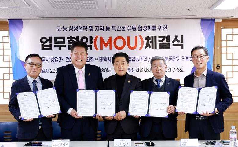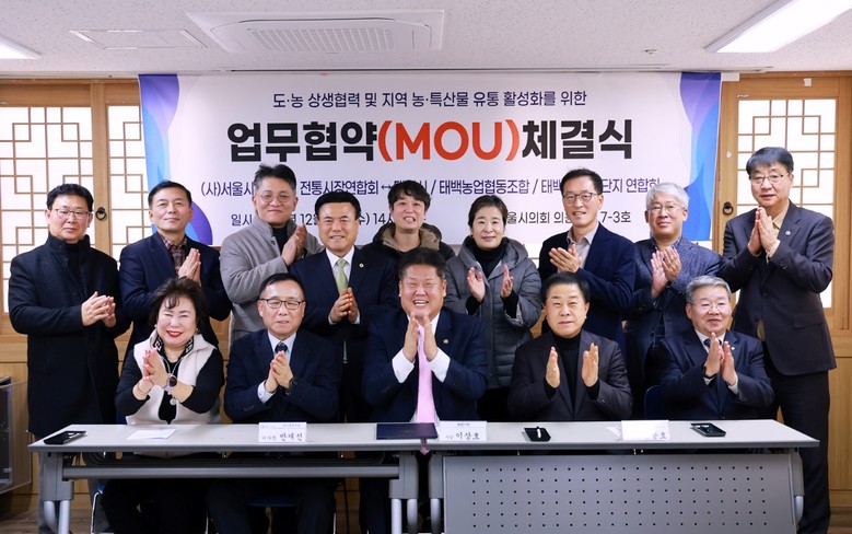 이날 협약은 전통시장 활성화와 지역 우수제품의 판로 확대, 지속 가능한 상생협력 체계 구축을 목적으로 김 의원을 비롯해 (사)서울시상점가전통시장연합회 반재선 이사장과 연합회 임원, 이상호 태백시장, 김병두 태백농협 협동조합장, 최이호 태백시 농공단지 연합회장, 태백시청 관계 공무원 등이 참석했다.