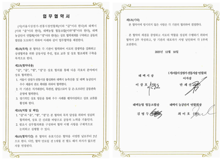 본 협약에 따라 각 기관은 ▲서울시 상점가·전통시장 활성화와 태백시 농축산물 및 농공단지 우수제품의 판로 확대 ▲직거래장터, 특별전, 팝업스토어 등 온·오프라인 공동 판촉행사 추진 ▲정기적인 상호 방문과 교류를 통한 우수사례 공유 ▲26년 하반기 김장김치 대축전 시 태백시와의 협력 등 다양한 분야에서 상생하기로 했다.