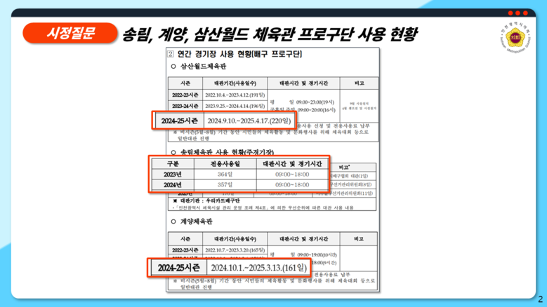 이에 대해 인천시는 시립체육시설의 공공성 강화를 위해 2026년 3월까지 운영 효율화 방안을 담은 용역을 완료하고, 그 결과를 시민에게 공개하겠다고 밝혔다. 또한 수탁기관과 협력해 정보공유, 자원 연계 등 현실적 문제 해결에 나서고, 비시즌 기간에는 체육시설을 시민에게 적극 개방하겠다고 답변했다.