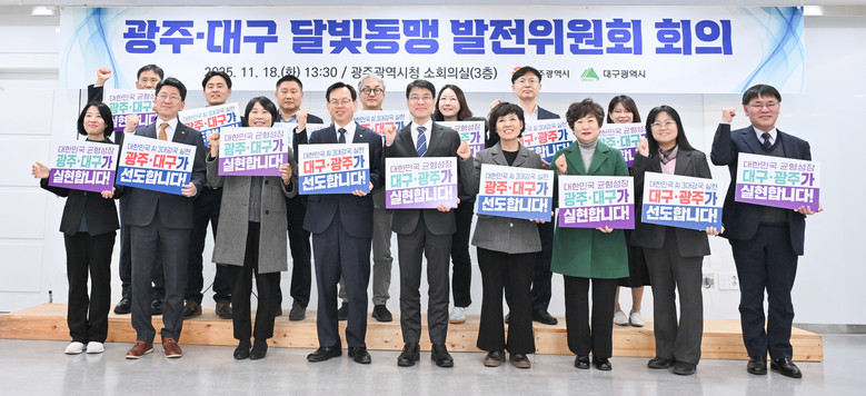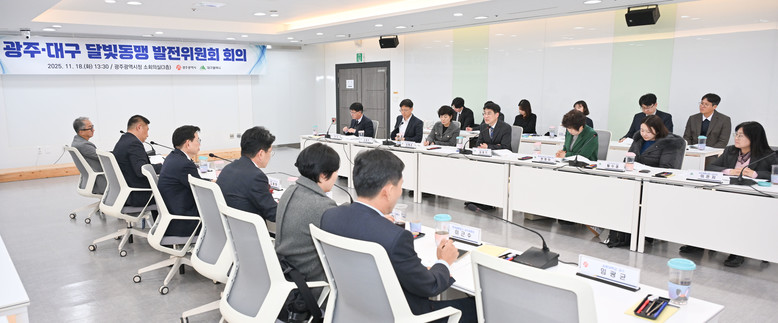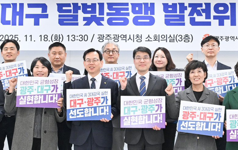 대구광역시와 광주광역시는 11월 18일(화) 오후 1시 30분, 광주시청에서 개최된 ‘2025년 달빛동맹발전위원회’에서 ‘대한민국 AI 3대 강국 선도’ 등의 비전을 담은 퍼포먼스를 통해 협력 의지를 다지며, 달빛철도에 이은 AI 중심의 초광역협력 2.0 시대 개막을 알렸다.