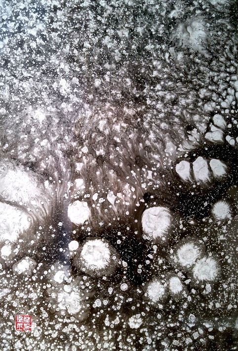 “고요한 시간에 눈 내리는 소리가 싸악싸악 들리듯이, 눈꽃송이 그림도 싸악싸악 하는 느낌을 갖고 작업을 합니다.” 1990년 백두산 천지를 다녀온 이래 수억만송의 눈꽃송이를 그렸지만 이 때문에 똑같은 눈꽃송이는 없단다. 흑백 모노크롬에 눈 내리는 소리를 음미하면서, 먹이 번지는 기법(발묵)과 먹을 다스리는 기법(박묵)으로 그려왔다. 그것도 눈이 소복히 쌓여 유독 눈 내리는 소리가 들리는 새벽시간에 말이다.