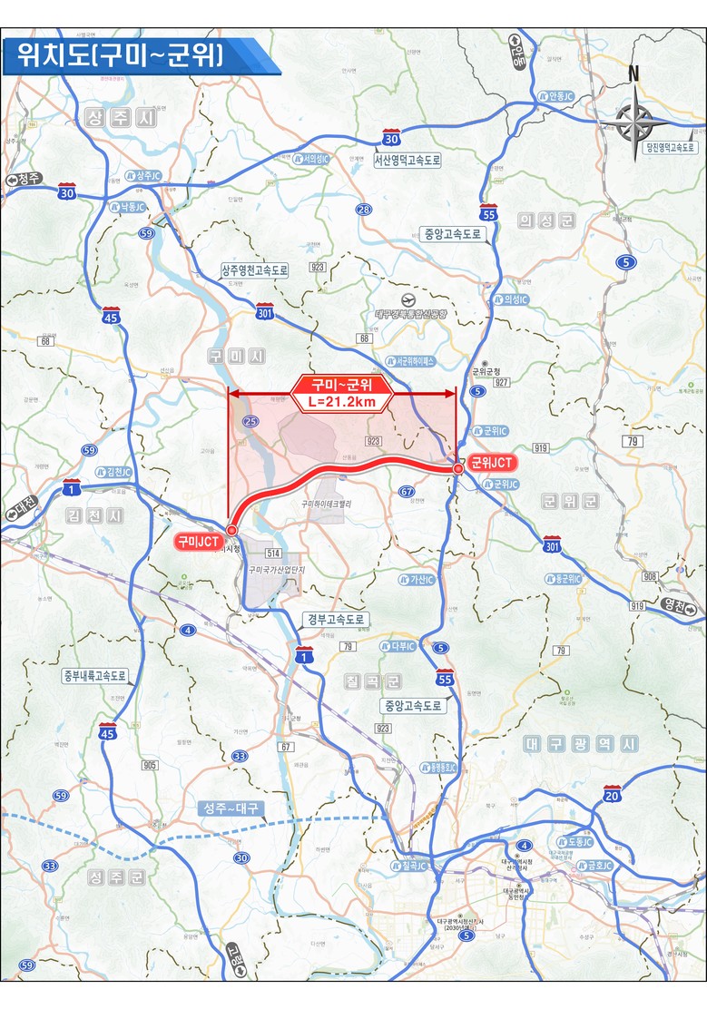 구미와 군위를 연결하는 구미-군위 고속도로는 대구 북부 중앙고속도로와 경북 서부 경부고속도로를 동서로 연결하는 국가간선도로망이며, 왕복 4차선 연장 21.2km 규모로 총사업비 1조 5,627억 원을 투입해 2029년 착공을 목표로 국가 재정 사업으로 본격 추진 된다.