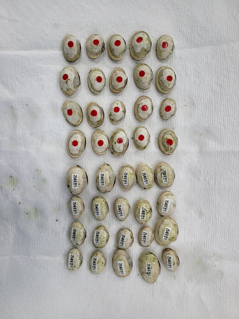 이번에 시험 방류한 어린 개조개는 2024년 10월과 2025년 5월에 확보한 어미를 이용하여 센터에서 생산한 것이다. 살포한 어린 개조개는 경남도 방류지침에 명시된 개조개 방류 크기(0.6㎝ 이상)보다 큰 1.0㎝ 이상으로 수산안전기술원에서 전염병 검사를 완료한 건강한 개체들이다.