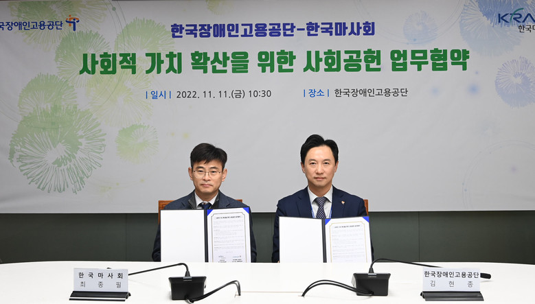 [세계타임즈 = 심하린 기자] 한국마사회(회장 정기환)와 한국장애인고용공단(이사장 조향현, 이하 ‘공단’)은 11일(금), 공단 본부에서 사회적 가치 실현을 위한 사회공헌 업무협약을 체결했다.