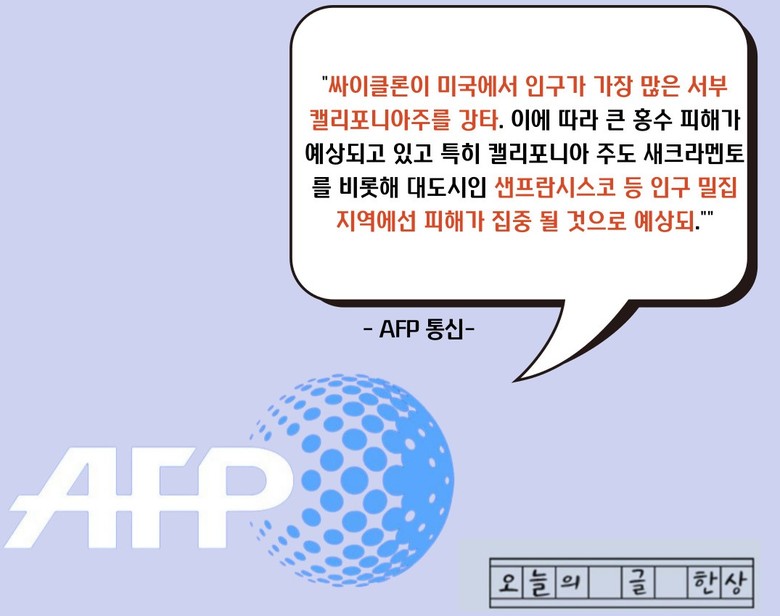 [세계타임즈 백진욱 기자] 지난 5일(현지시간) AFP통신이 사이클론이 서부 캘리포니아주를 강타했다고 발표했다.